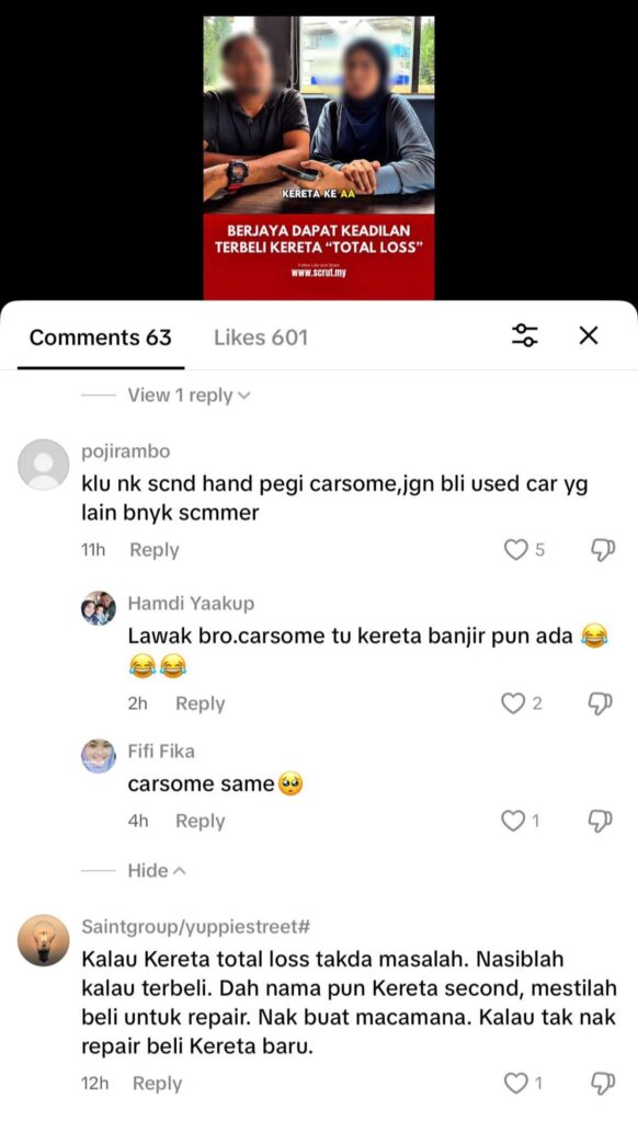Okay aku nak komen juga dari komentar yang berkata beli kereta “total loss” tu biasa dan tiada masalah. “Dah kata beli kereta second, memang untuk repair”. Ulas sang penjual kereta ni kot.