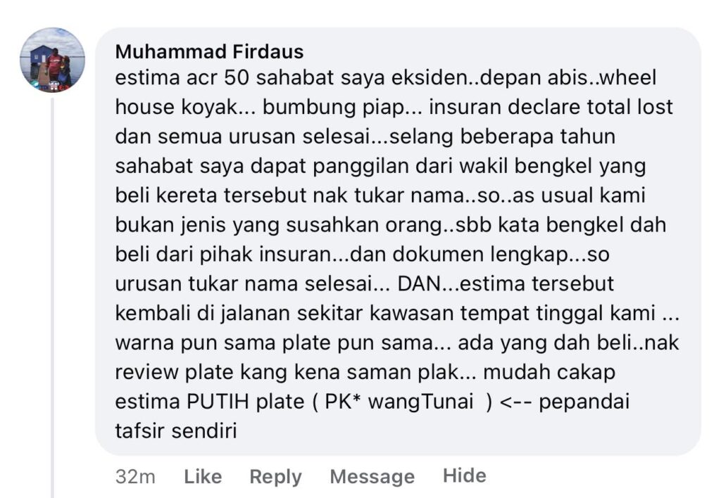 Kereta yang sudah istihar “total loss” tapi masih ada di jalanan bertuankan yang baru dan akan ada masalah baru nantik kemudian hari.