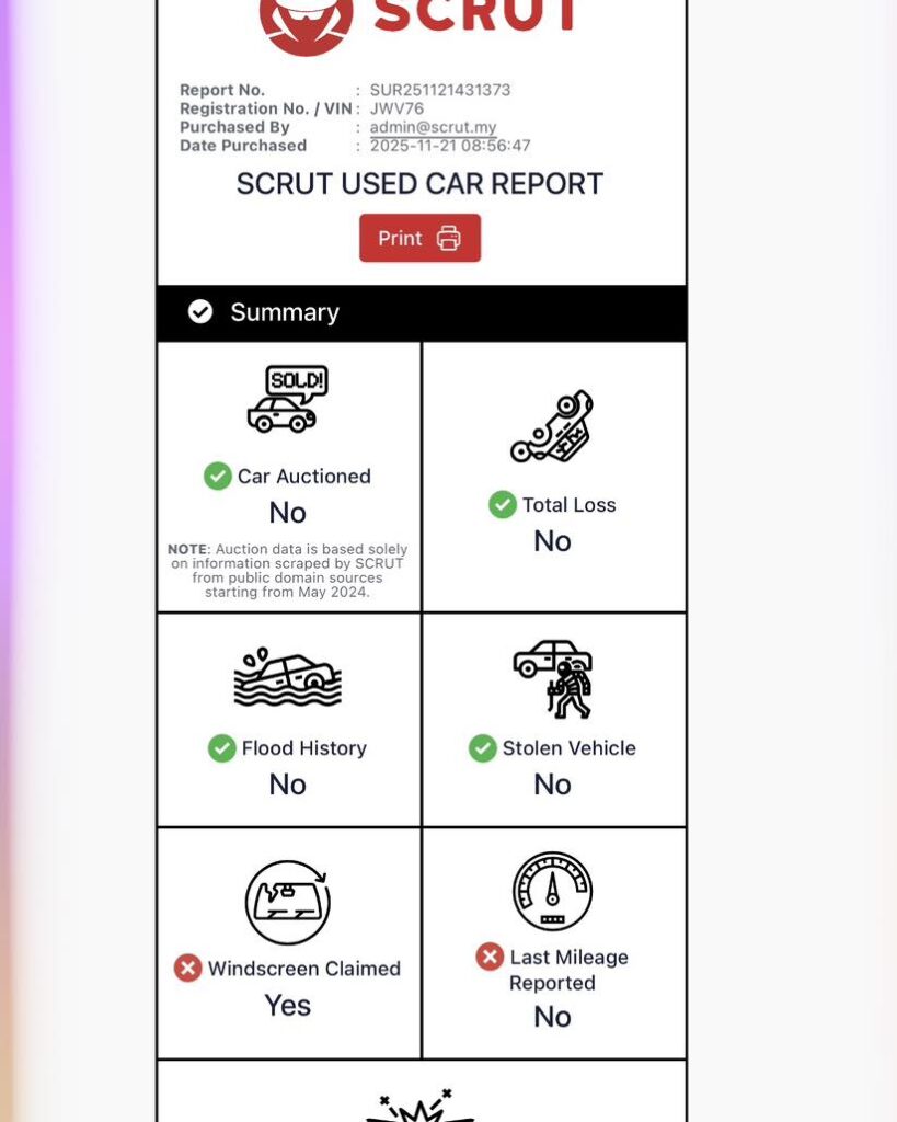 Menurut laporan SCRUT Usedcar report (SUr), kereta tersebut tidak dilaporkan pernah mengalami kemalangan.